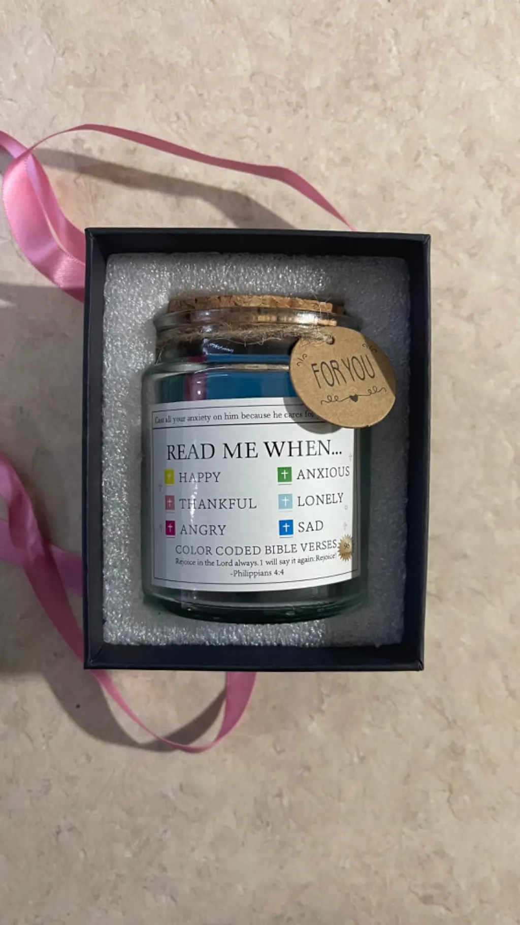 I bought Bible Verse Jar for 3 special friends as a gift during Mother's Day. Was looking for something religious that would make them to remember me as a good friend in faith. It contains Bible verses for each emotion and/or feelings and the whole family can use it even the kids. Verses are impressed in good quality of paper and each color is a different feeling or emotion, easy to use, adds a spiritual touch to any home or office.