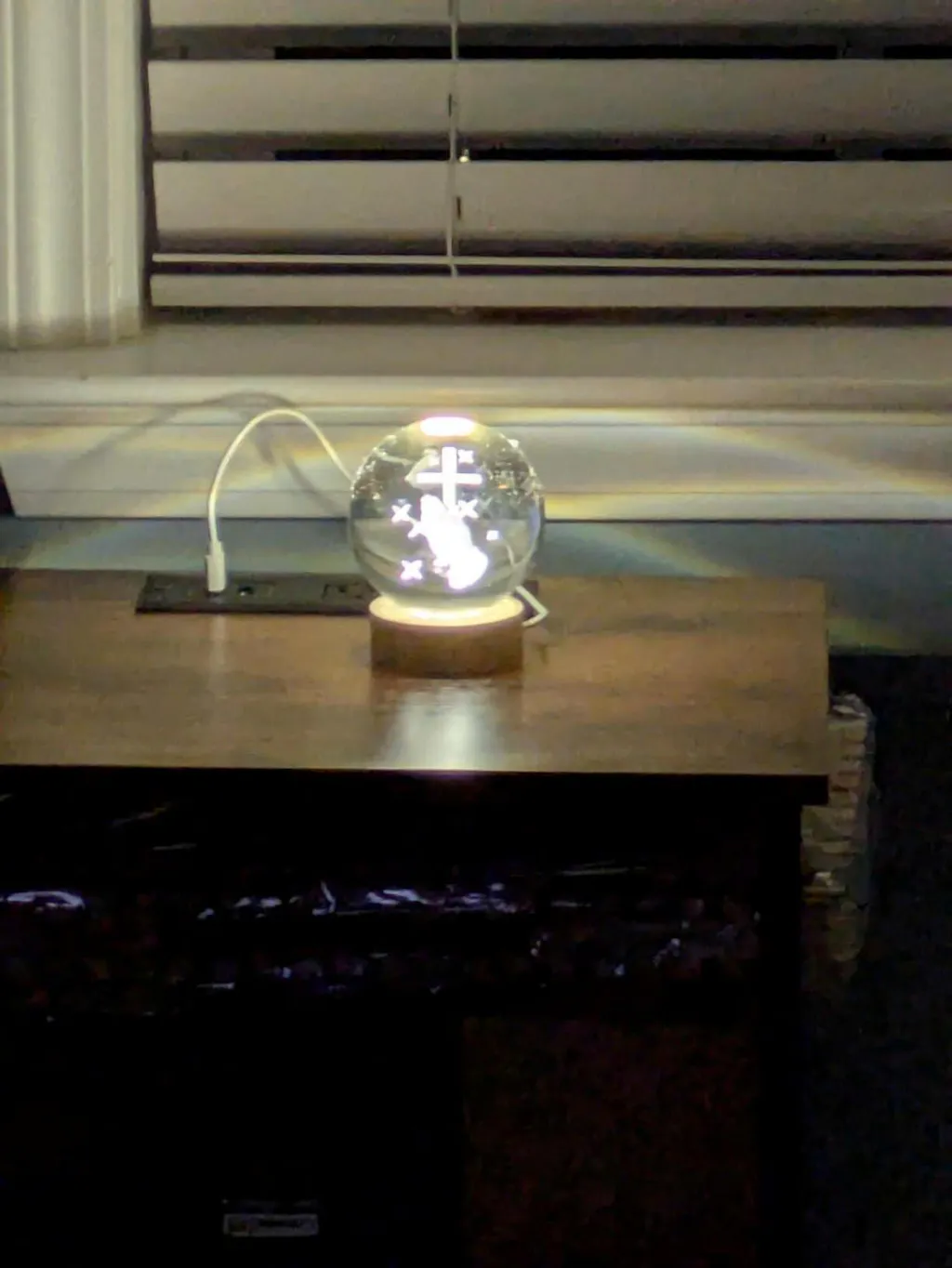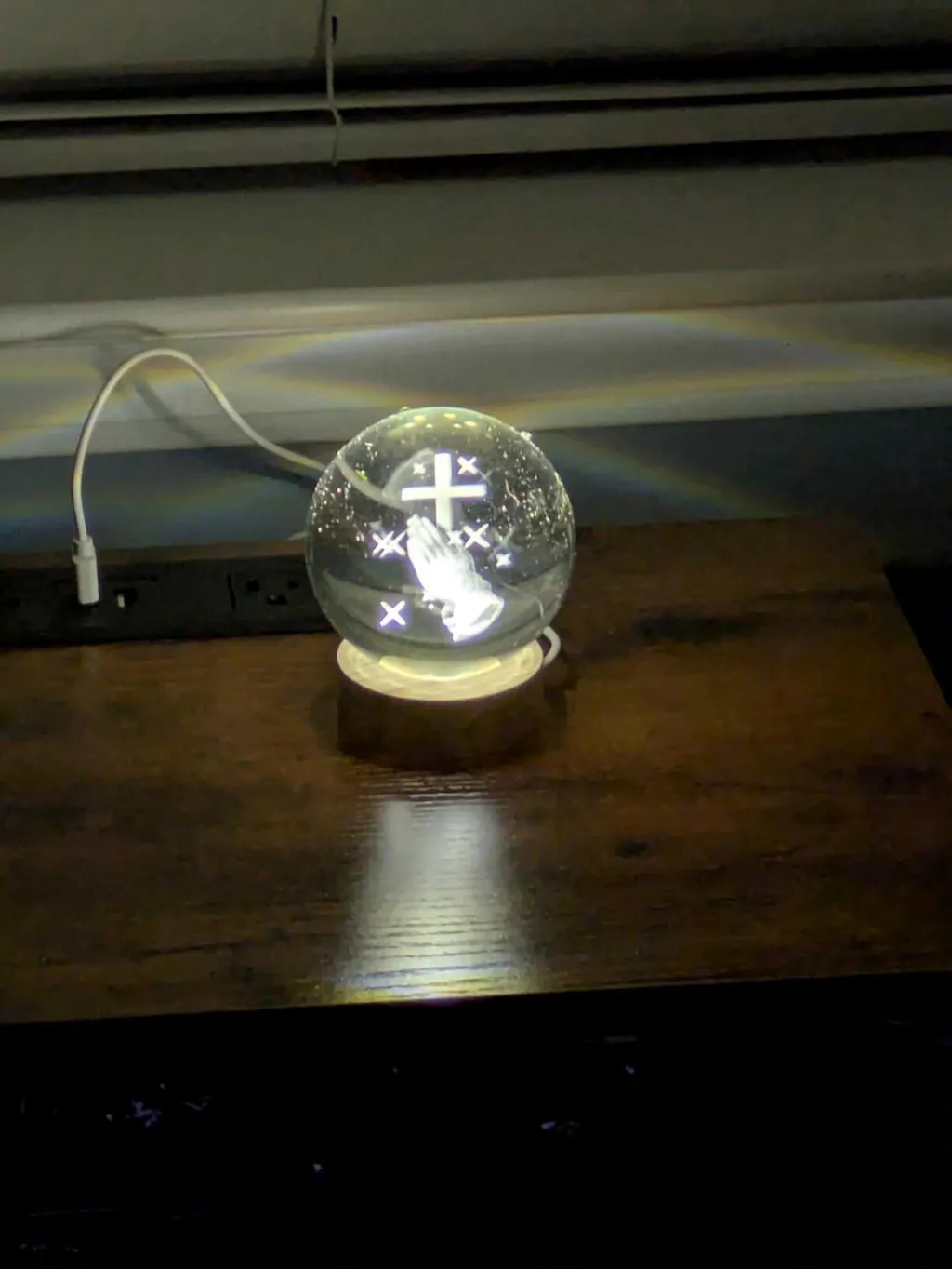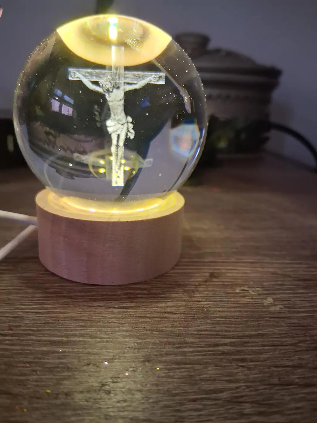 I bought this crystal ball with praying hands and a cross design to create a peaceful atmosphere for prayer, and it truly delivers. The ball is approximately 10 inches in diameter and 4 inches tall including the base. Up close, its brightness is surprisingly high, yet not glaring—its light is just right, safely guiding you to the bathroom at night without worrying about tripping. It emits a soft, tranquil glow, perfect for quiet meditation. I tried taking photos and videos, but it was difficult to capture the clear details of the praying hands in a photograph. However, the product images perfectly match the actual item—the details are exquisitely beautiful in person. Overall, it's a beautiful and meaningful piece that brings a sense of peace and tranquility to any space. I highly recommend it to anyone looking to beautify their prayer space—or simply want a soft, beautiful, and spiritually meaningful nightlight.