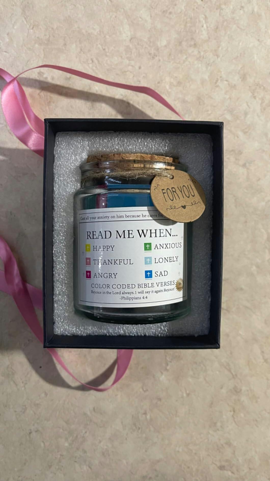 I bought Bible Verse Jar for 3 special friends as a gift during Mother's Day. Was looking for something religious that would make them to remember me as a good friend in faith. It contains Bible verses for each emotion and/or feelings and the whole family can use it even the kids. Verses are impressed in good quality of paper and each color is a different feeling or emotion, easy to use, adds a spiritual touch to any home or office.