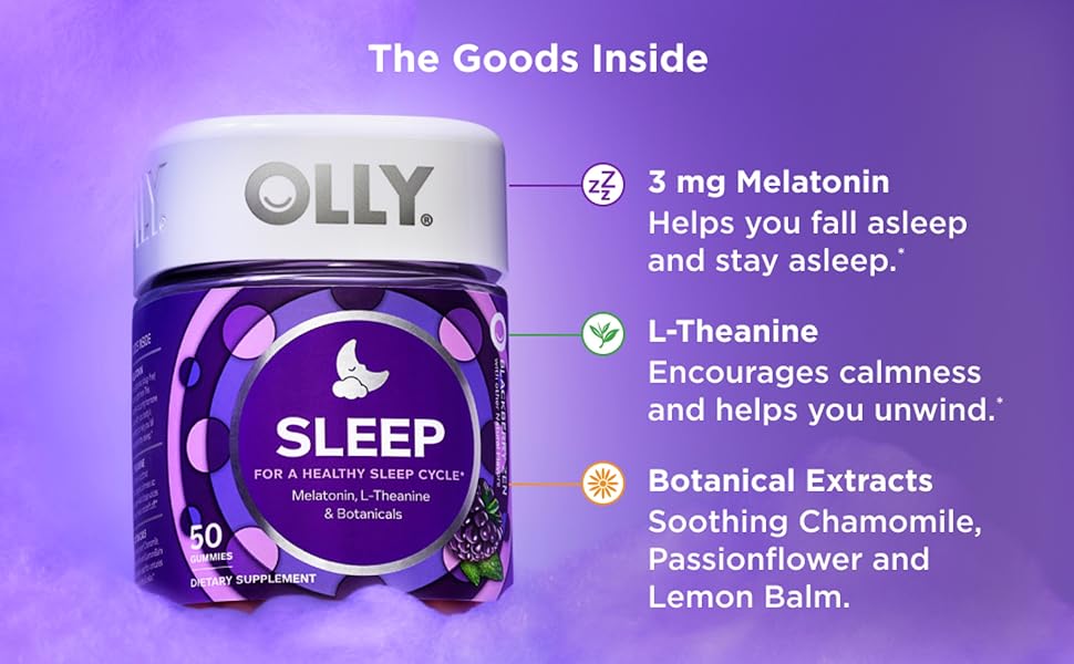 OLLY Sleep is a drug-free, non-habit-forming nighttime blend of snooze-friendly ingredients that support a healthy sleep cycle. Melatonin works with your body to help you fall asleep and stay asleep. L-Theanine is a calming amino acid that helps quiet the mind. We also included traditionally used botanical extracts Chamomile, Passionflower and Lemon Balm.