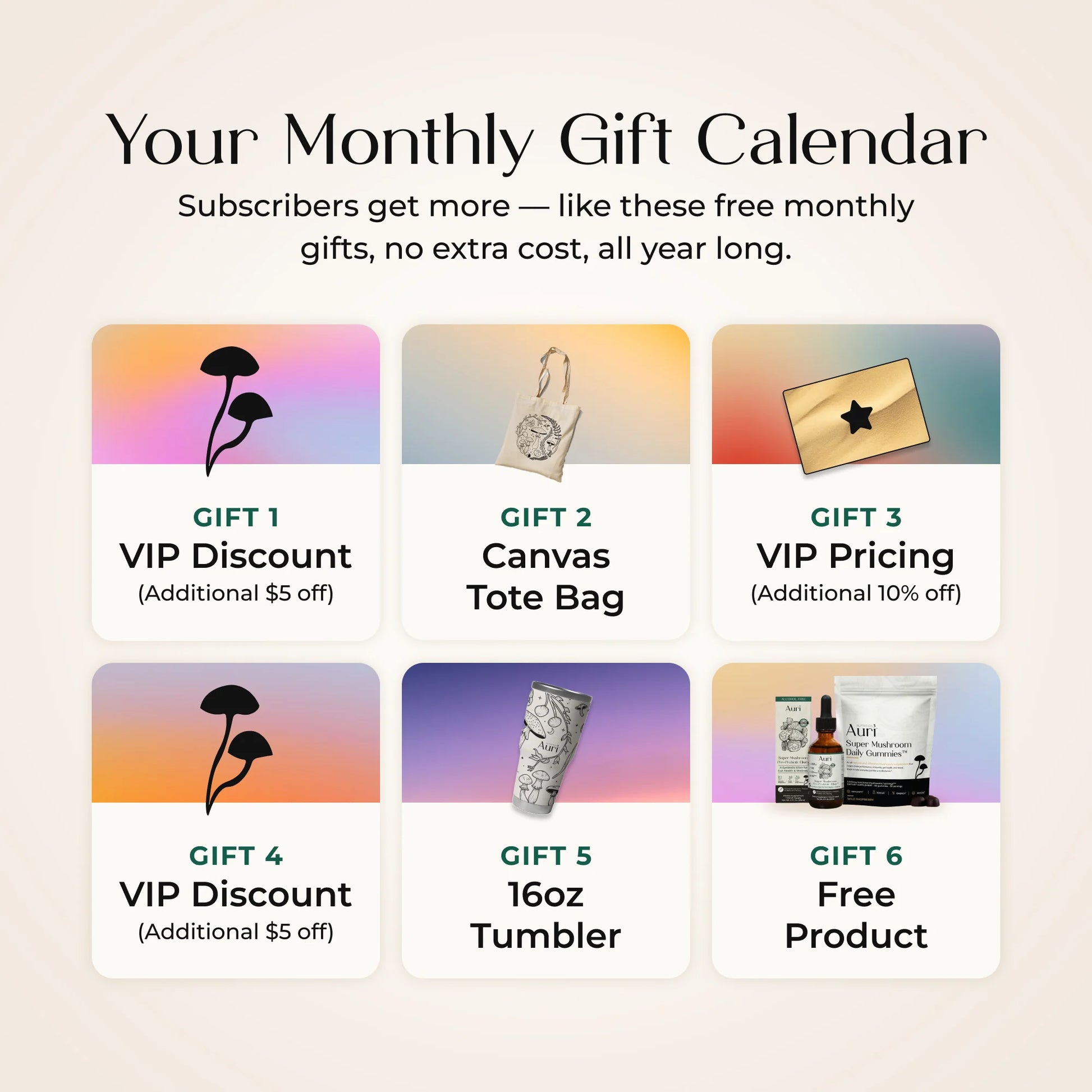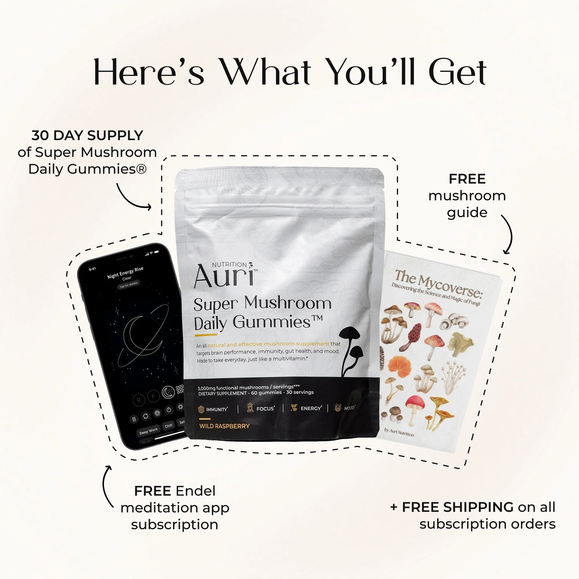 FUNCTIONAL BENEFITSFOR SUPERIORWELLBEING-Become your best self with the Aurimushroom gummies for adults and kids that includeingredients shown to help increase focus 8 memorysupport immunity and gut health.