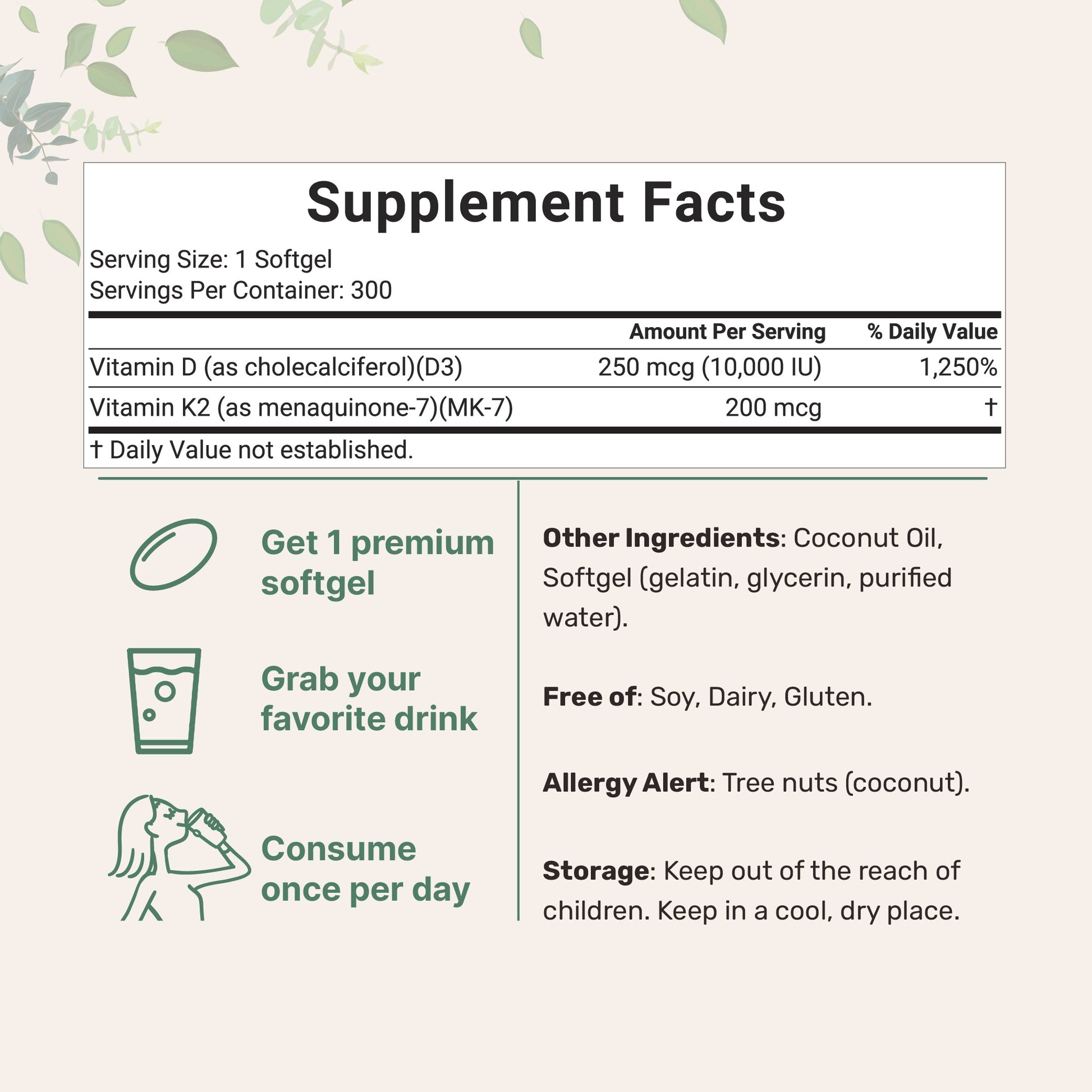 - Timing: Take with meals (as D3 and K2 are fat-soluble vitamins, pairing them with dietary fats + the coconut oil in the product enhances absorption efficiency)